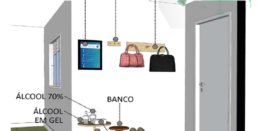 · Já dentro da sua casa com moradores negativados para o Covid-19 é orientado estabelecer a área de transição de entrada e saída, uma base com a higienização para mãos e sapatos, assim como ilustra a imagem abaixo: