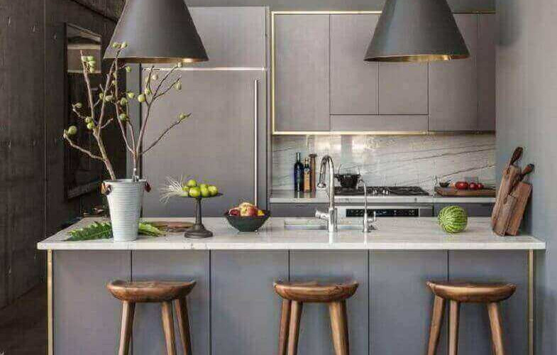 Posicionar pendentes sobre a mesa da cozinha também é uma opção para dar destaque a essa região e ajudar na iluminação dos alimentos. Além de usá-los em conjunto, optar por modelos diferentes, mas que sigam uma mesma proposta, é uma alternativa moderna.